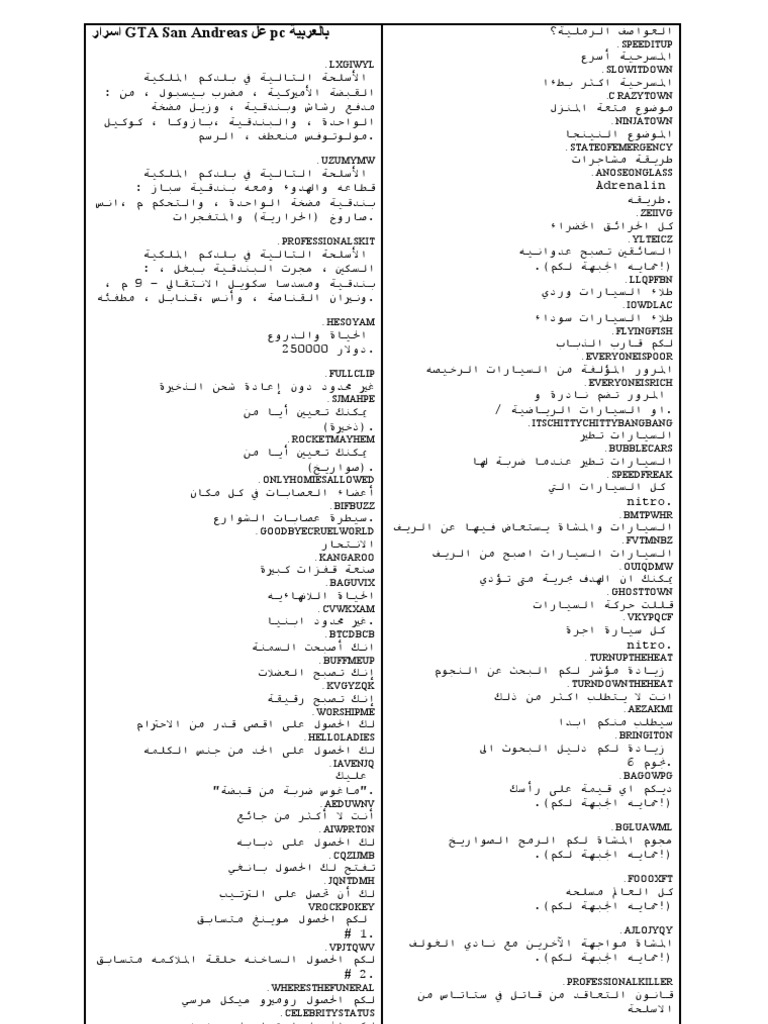 كلمات سان اندرس جميع اكواد كلمات سر جاتا سان اندرس Gta San